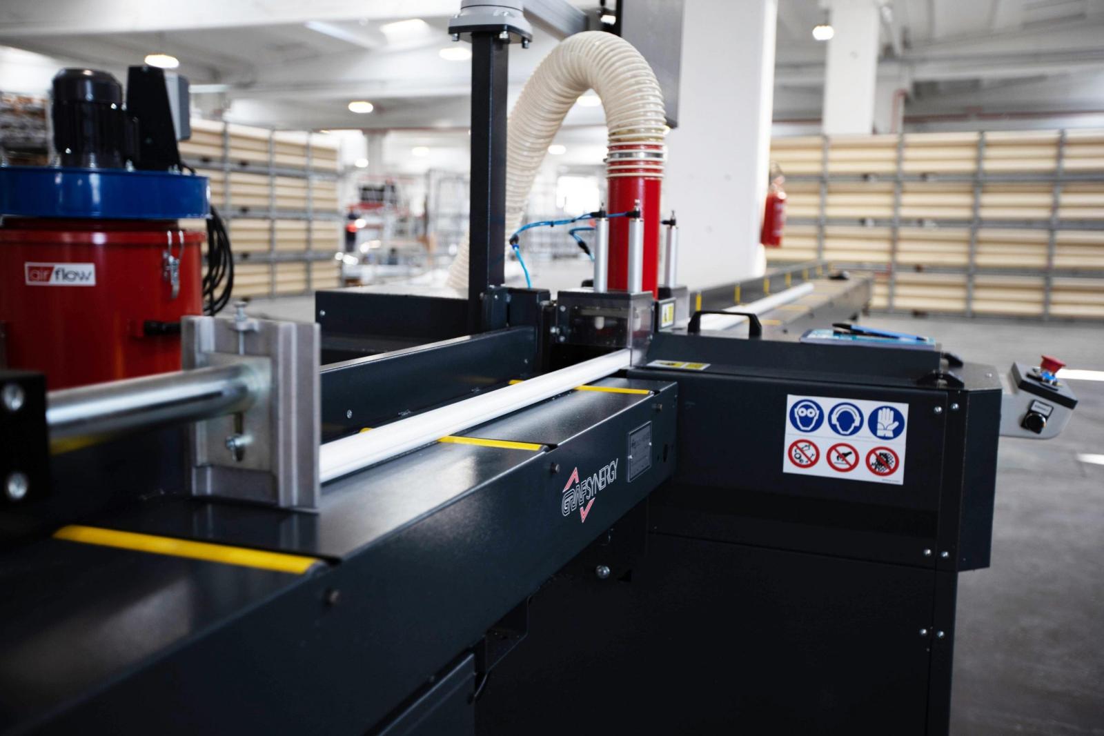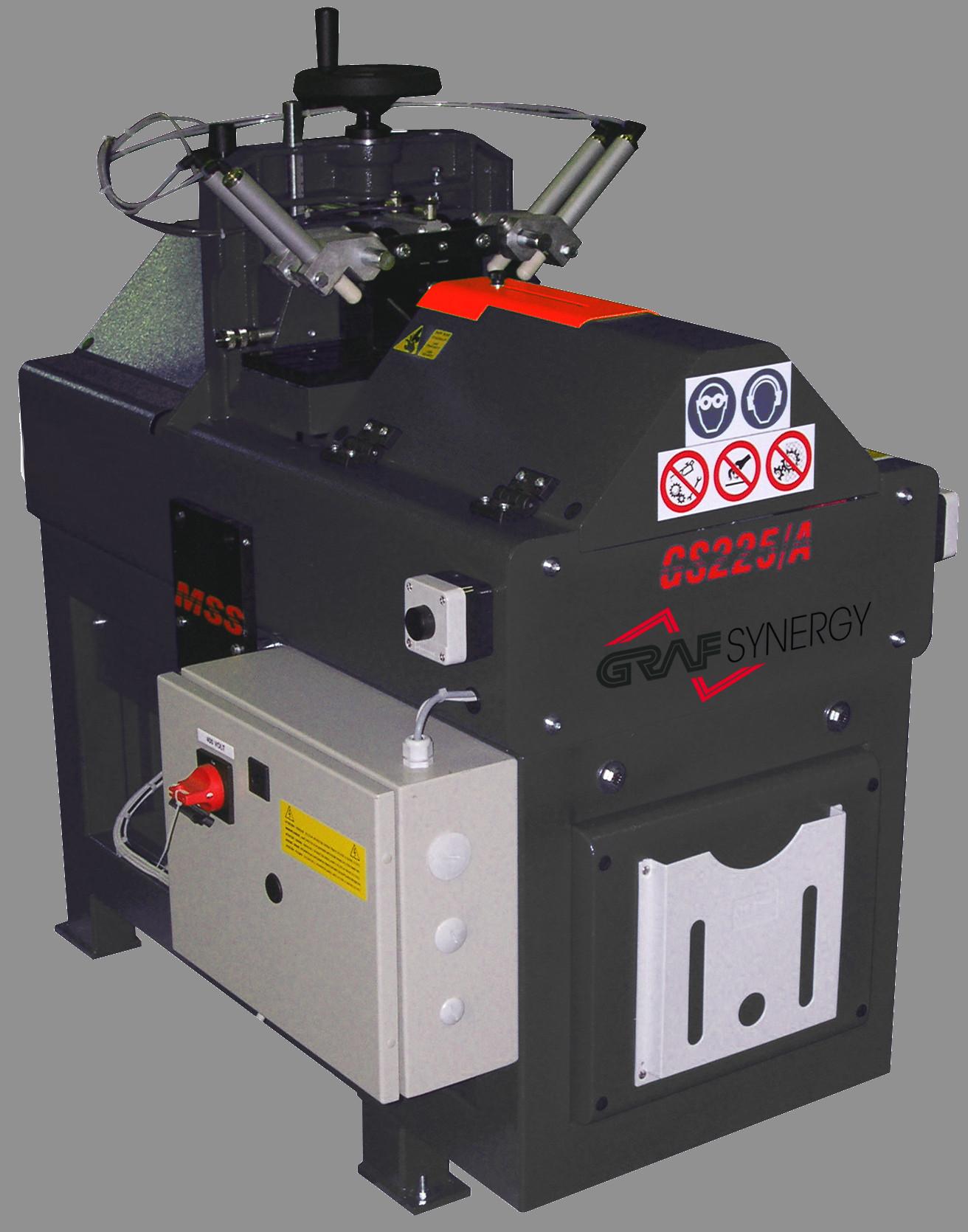 Dubbele zaagmachine met CNC gestuurde assen voor het zagen van PVC glaslatten. De machine komt met 2 vaste zaagbladen Ø 200 mm en 2 bijkomende zaagbladen Ø 98 mm. De zaagbladen staan vast gemonteerd onder 45°.
